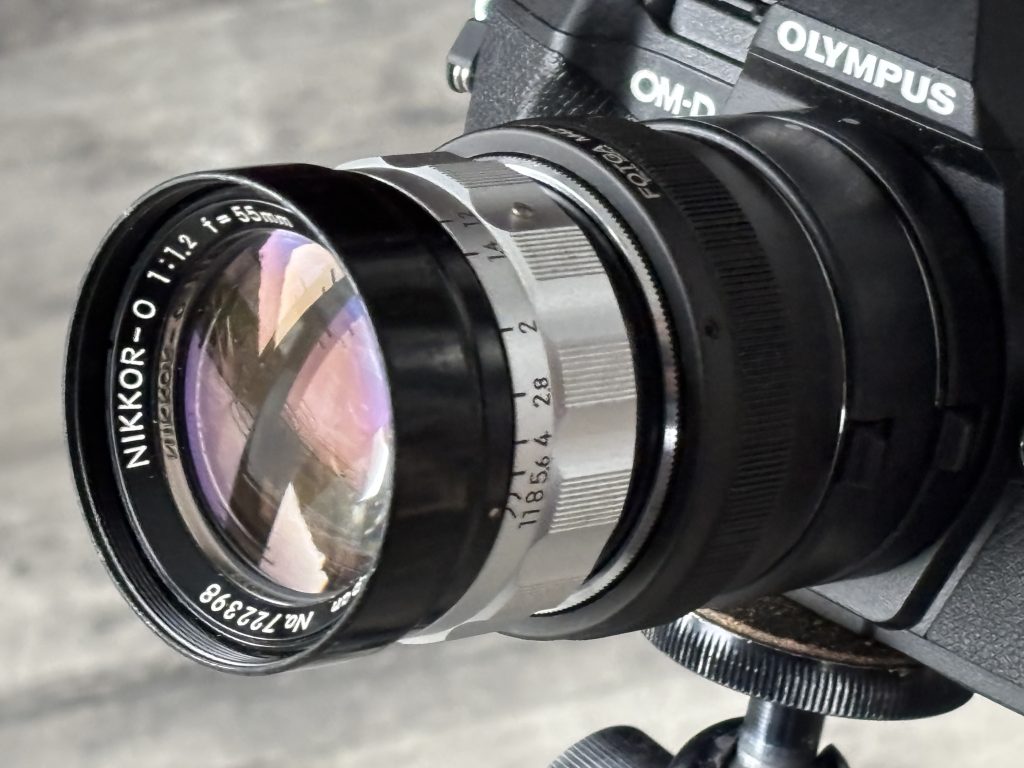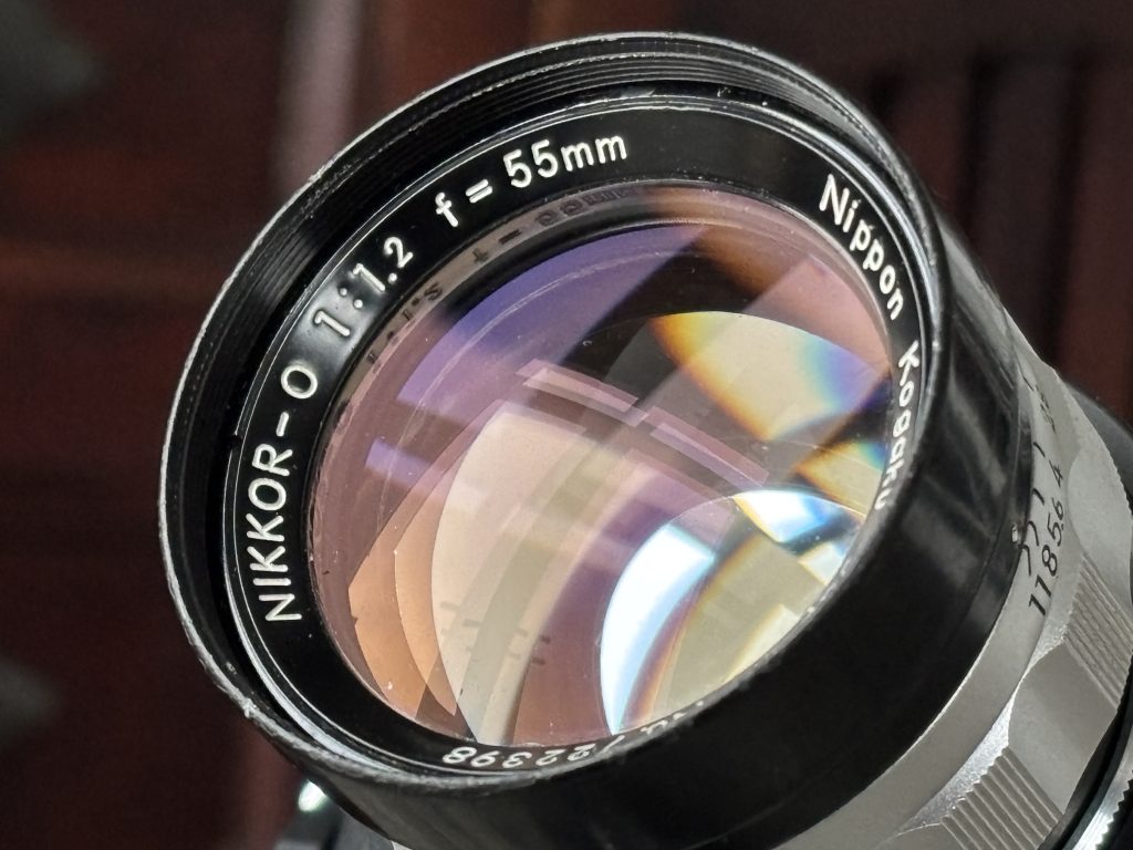 In the 1960s, pushing aperture boundaries was a prestige race among camera manufacturers. Nikon introduced the 55mm f/1.2 before the more common 50mm f/1.2 designs became standard. The “O” designation refers to its 7-element optical formula (“O” indicating seven elements in Nikon’s naming convention of the era).