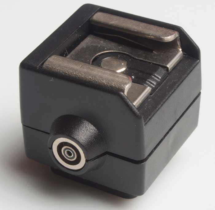 Used hot shoe adaptor, slides onto a camera hot shoe and provides a pc socket and a hotshoe on top. This is so a studio flash or portable flash moved away from the camera can be fired via a PC cable at the same time as the on camera flash.